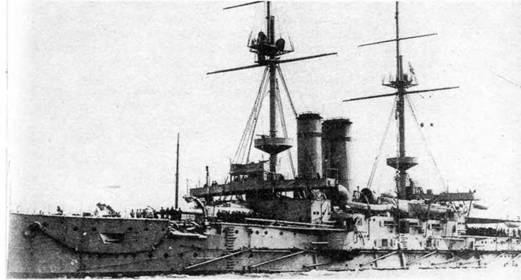 Броненосец "Canopus". В 1914 г. являлся уже устаревшим и тихоходным кораблем.