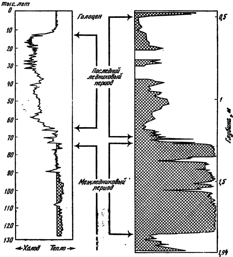 На рис. 2 приведены результаты анализов климата Земли за последние 130140 тыс. лет. Одна кривая характеризует результаты анализа колонок льда в Гренландии по кислороду, другая в горах Франции по радиоуглероду. Оба анализа независимо друг от друга указывают на наличие последнего ледникового периода примерно 1580 тыс. лет назад и наступление 1015 тыс. лет назад последнего межледникового периода. Чередование этих периодов происходило в северном и южном полушариях.