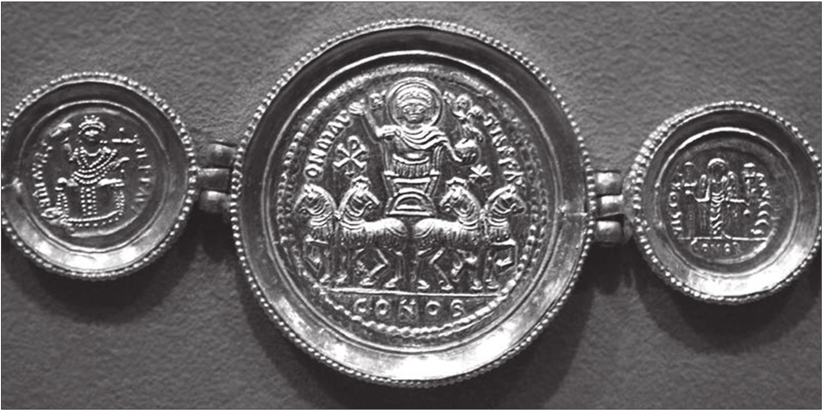 Фрагмент браслета, при створенні якого були використані золоті монети-соліди, карбовані у Константинополі. Метрополітен-музей, Нью-Йорк.