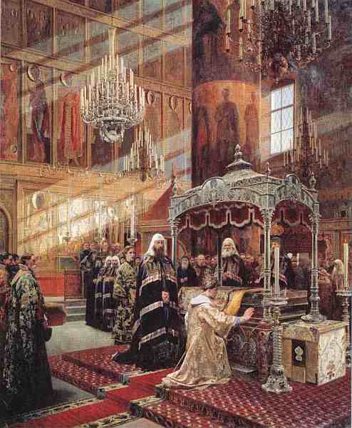 На соборе святителей, съехавшихся в Москву для избрания патриарха, избран был в угоду царю, конечно, Никон. По совершении всех обычных при этом обрядов и молебствий царь послал «по новоизбранного патриарха» на Новгородское подворье, но Никон решительно отказался принять на себя этот сан. Несколько раз государь посылал святителей и бояр уговаривать Никона, но он оставался непреклонным. Тогда царь велел привести его против воли в церковь. Он был приведен. Государь, бояре, святители долго, но без успеха умоляли его принять патриаршество. Наконец царь и все присутствовавшие в церкви пали на землю и со слезами молили его исполнить общую просьбу. Никон был сильно тронут этим, заплакал сам и обратился к царю и всем бывшим в церкви с такими словами: