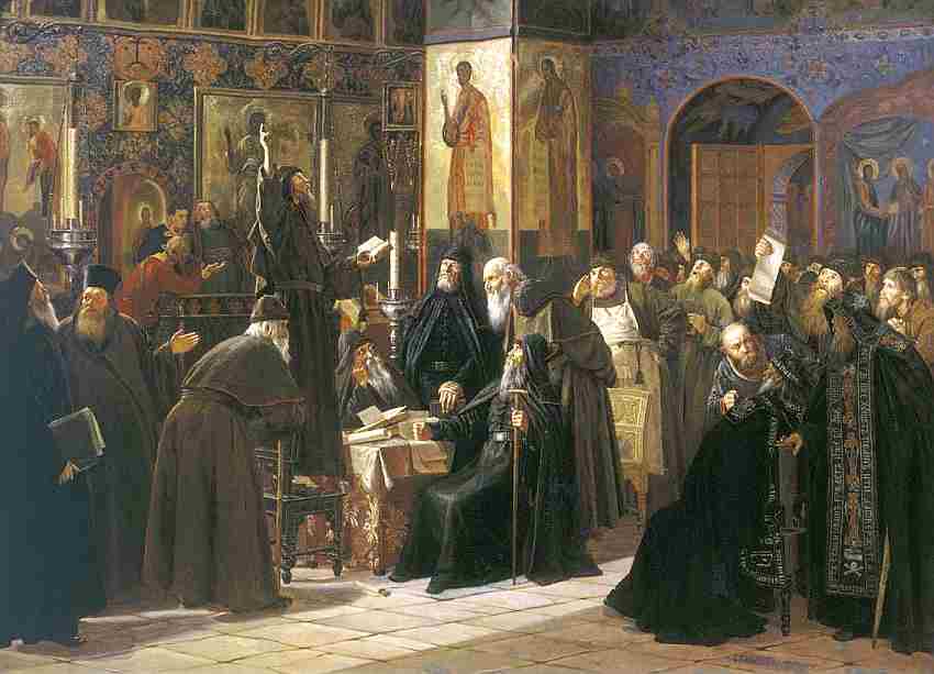 На соборе дело приняло такой вид, как будто бы между царем и патриархом шла тяжба, а собор должен был совершить суд. Сам государь со слезами на глазах, взволнованным голосом начал жаловаться на самовольное удаление патриарха, на восьмилетнюю смуту в церковных делах и заявил, что никакой вражды не питал к Никону.