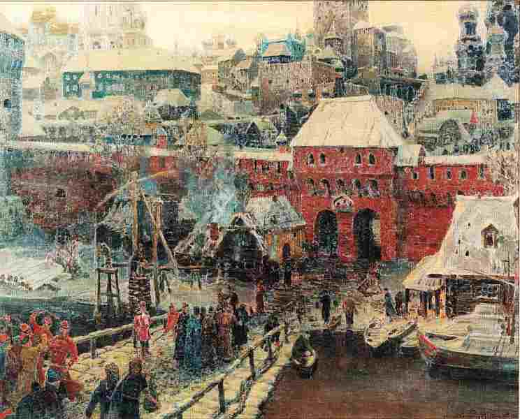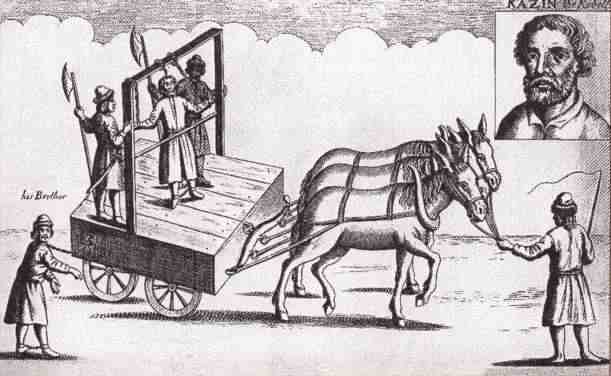 Толпы народа действительно вышли за город поглазеть на Разина, когда его везли в Москву. На большой телеге была поставлена виселица, к перекладине был привязан Стенька за шею; руки и ноги были прикреплены цепями к телеге. За ней должен был бежать Фролка, привязанный к краю ее цепью за шею.