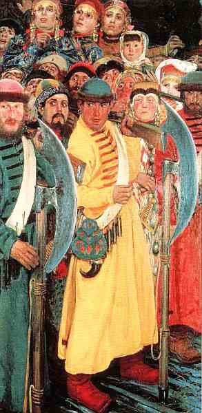 с дьяком или подьячим; пристава, взяв его за руки, вели по городу, а на лошадь садиться не давали. (Пешком идти для боярина считалось уже унижением.) Когда же приводили во двор к обиженному боярину, то ставили приведенного у нижнего крыльца, и дьяк или подьячий приказывал известить о своем приходе хозяина. Когда тот выходил на крыльцо, дьяк говорил ему: