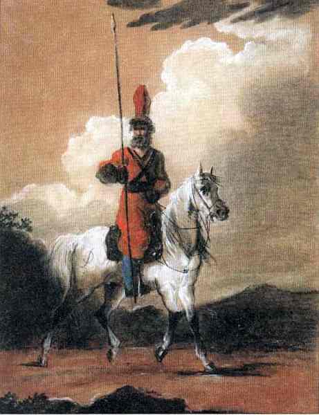 Впереди идет передовой полк, пред которым шествуют пять тысяч стрельцов, по пяти в ряд, в зеленых кафтанах, с длинными пищалями. За ними ведут несколько воеводских коней, богато убранных. Далее едет воевода передового полка один. У него при седле небольшой набат в виде котла; позади его нестройной толпой едут ратные люди его полка. Если кто поравняется с воеводой или обгонит его, он ударяет плетью по набату, чтобы обогнавший его отошел назад. За передовым полком идет большой полк с множеством трубачей, литаврщиков; те и другие трубят в трубы и бьют в литавры. Эта нестройная музыка наводила на иностранцев уныние. За музыкантами идут опять несколько тысяч стрельцов, одетых в красные кафтаны, по пяти в ряд, а за ними ведут коней большого воеводы, в богатом убранстве, и едет сам он в сопровождении военных советников и иностранцев. Затем следует большой полк нестройной толпой. Направо от него идет правый, налево левый полк. Позади всех идет огромный обоз.