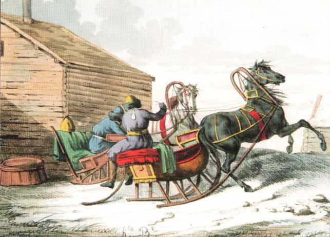 Важные лица считали в старину неприличным для себя ходить по улице пешком, хотя бы надо было пройти несколько шагов. Летом бояре и дворяне обыкновенно ездили верхом, а старики в колымагах; зимой в санях. Верховые кони у бояр убирались очень богато: седла, обитые бархатом или сафьяном, вышитым золотом, роскошные чепраки, серебряные цепи, сбруя, уздечки, позолоченные бляхи, колокольцы и бубенцы все это блестело и гремело, так что уже издали можно было заметить и услышать едущего боярина; притом он время от времени ударял в небольшие литавры, прикрепленные к седлу, чтобы проходящие сторонились и давали дорогу. Зимой богатые люди щеголяли санями, которые обивались дорогими материями. На спинку саней обыкновенно набрасывали дорогой персидский или турецкий ковер, а сверху накидывалась медвежья полость. Сани были очень простого устройства и небольшие; запрягалась в них одна лошадь, тоже богато убранная цепочками, колечками, разноцветными перьями и звериными хвостами, лисьими или собольими. Возница, по большей части молодой парень, сидел верхом на лошади и правил ею. Когда именитый боярин усаживался в сани, то в ногах у него становились два холопа, по бокам тоже шло несколько человек, а сзади следовал мальчик. При парадных выездах царя два ближних боярина стояли на запятках, а два стольника находились по обе стороны, у ног царя, и поддерживали полость; по сторонам шли придворные и стрельцы.