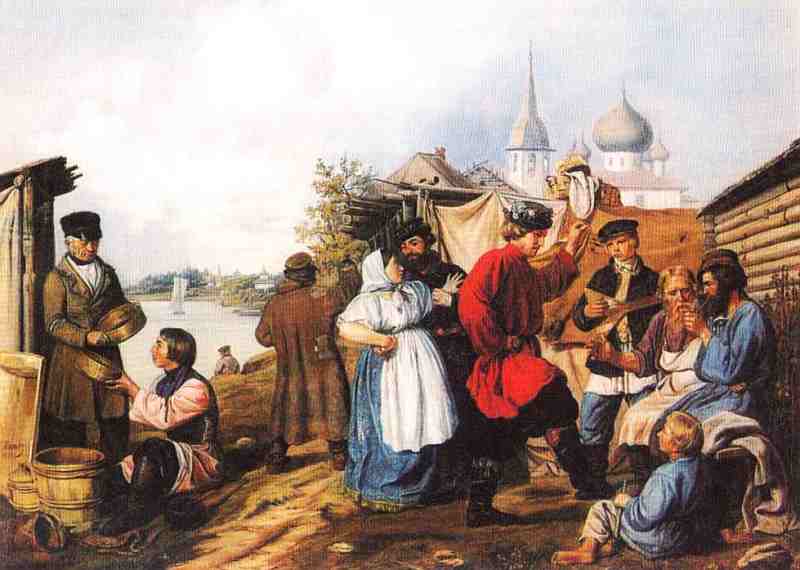 игрой на которых скоморохи тешили православный люд. Нередко они составляли ватаги странствующих музыкантов и плясунов и переходили из одного посада в другой, из села в село. Развлекали они толпу не только музыкой и пением, но и другими способами: одни играли на разных инструментах, другие плясали, третьи показывали ученых медведей и собак. Были тут глумцы, шутники-потешники, умевшие говорить складно разные прибаутки, вроде теперешних раешников на Масленице. Были лицедеи, которые, надев на себя личины, или хари (то есть маски), обыкновенно уродливые или смешные, да нарядившись в чудное (скоморошное) платье, разыгрывали разные действа. Были и такие, что носили на голове доску с движущимися куклами, обвертят вокруг пояса кусок полотна, поднимут его вверх над головой, так что лица не видно, и приводят в движение куклы, приговаривая за них на разные голоса (марионетки или петрушки нашего времени). Особенное раздолье скоморохам было на Масленицу, на Святки, на Пасху, когда многие и благочестивые русские люди позволяли себе отдаваться веселью и приглашали их даже на дом. Скоморохи ходили обыкновенно большими ватагами человек в пятьдесят и более, потому что часто случалось, что их обижали лихие люди, отбирали у них набранные деньги, но нередко и сами они грабили на больших дорогах. По временам правительство по внушению церкви принималось особенно ревностно преследовать скоморошество, приказывало воеводам ломать и жечь инструменты и хари, даже бить батогами тех, кто зазывал к себе скоморохов. При Михаиле Федоровиче в Москве раз отобрали не только у скоморохов, но и по всем домам музыкальные инструменты собрали их пять возов и сожгли. Но проходило время горячего преследования, и природа русского человека, любящего веселье и широкий разгул, брала свое, и скоморохи, эти «сатанины ученики», как называло их духовенство, «неистовой гудьбой, скаканием, плясанием» снова совращали людей с пути истины.