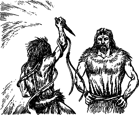 Сын Агу на виду у пленных вынул из-под набедренной шкуры два плоских камня, выбил искру и развел костер. Людоеды в ужасе округлили глаза, сквозь смуглую кожу на их лицах проступила бледность. Обезумев от страха перед белотелым великаном, которого не берет нож и который достает огонь из камня, пленники дрожали всем телом и жались друг к другу.