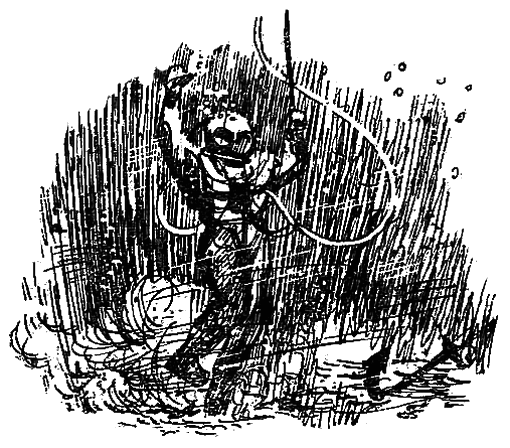 А я опять один остался на грунте Который теперь час? Не узнать под водой времени. Мне кажется, что прошло уже часов десять или двенадцать. Воды в костюме много. Коченею. Принялся чечотку свинцовыми подметками дробить, не от веселья, конечно. Плясал, плясал, уж ног не поднять. Стал вверх поглядывать, не идет ли помощь. Наконец вижу: приближается из водяного тумана две знакомые подметки, колышутся обитые красной медью, носки