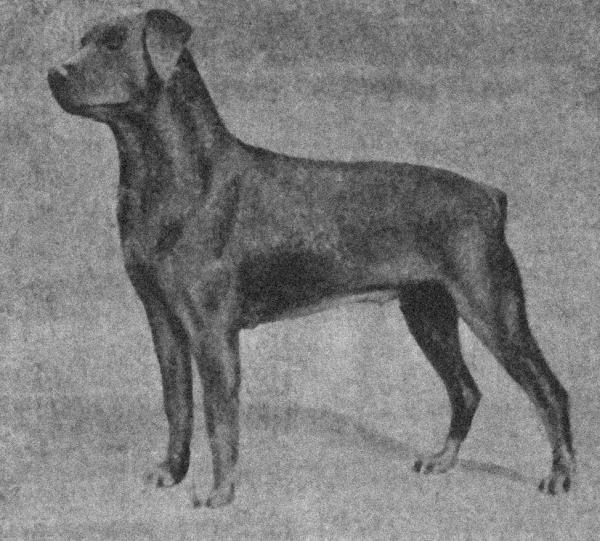 Передние конечности. Обе ноги крепкие, со всех сторон перпендикулярны к земле, без малейших изгибов. Лопаточно-плечевое сочленение развитое и косо поставленное. Предплечье мощное, прямое до запястья. Пясть мощная и хорошо развитая.