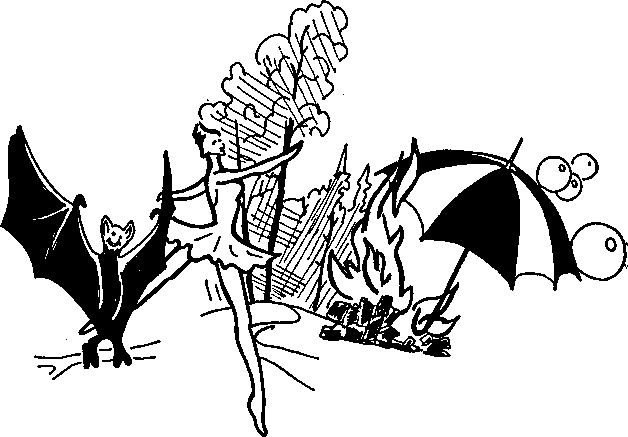 2 период. В кровати запуталась летучая мышь (Литий). К кровати подходит балерина (Бериллий), брезгливо берет летучую мышь за крылышки и несет ее в сосновый бор (Бор), чтобы выпустить на волю. Начинает смеркаться и холодать. Чтобы не замерзнуть, балерина разжигает костер и греется у черных пахучих углей (Углерод). Вдруг пошел дождь, и она спряталась под зонтиком (Азот).