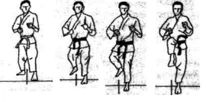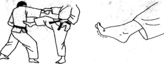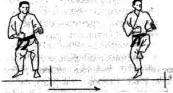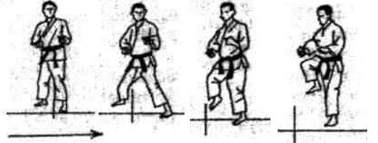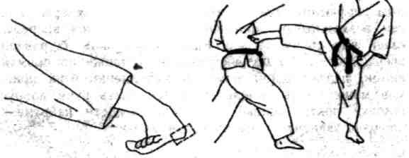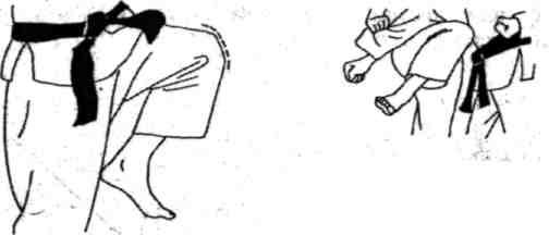 Если центр тяжести даже незначительно выдвигается из площади опоры в направлении цели при проведении удара ногой вперед, колено опорной ноги выводится слишком далеко вперед и пятка поднимается. В результате удар ногой получается неэффективным. Точно так же, если вы ударили ногой по чересчур удаленной цели, а затем пытаетесь вернуть бьющую стопу в ее прежнюю позицию, вы можете потерять равновесие и упасть. Избегайте этих ошибок и сохраняйте равновесие, когда бьете ногой, перемещая площадь опоры (опорную стопу) в соответствии с положением, центра' тяжести. Добивайтесь этого возвращением атакующей ноги в новую позицию перед опорной ногой, вместо того чтобы сразу же нести ее в прежнее, исходное положение, а затем принимайте ДзэнкуцуДачи или иную подходящую стойку. Из этой сбалансированной позиции вы будете готовы выполнить следующие приемы.