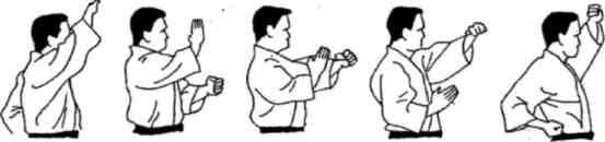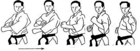 2. Если левая кисть находится перед телом, то, начиная блок, раскройте ладонь, направьте пальцы вверх и ребром кисти наружу. Возвращайте кисть в позицию над левым бедром, опуская ее прямо перед носом. Сожмите кулак, когда левая кисть достигнет бедра.