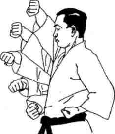 Рисунки показывают последовательность движения частей тела в блоке. Движение начинается с возвращающейся руки, затем переходит к бедрам и только потом достигает блокирующей руки.