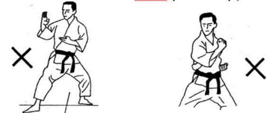 Избегайте двигать локоть в любом направлении из предписанной позиции. Ваш блок будет слабым, если локоть уйдет от тела вперёд, как показано на рис. А на Рис. В (там же) также показывает локоть, слишком удалившийся в сторону от предписанной позиции.