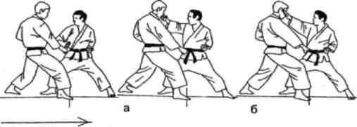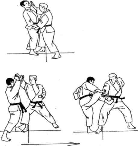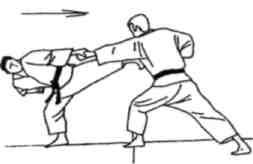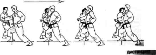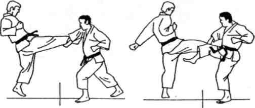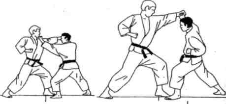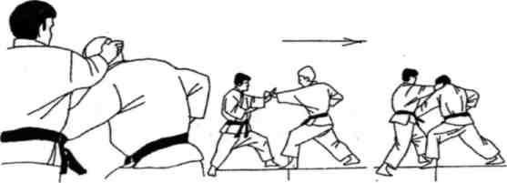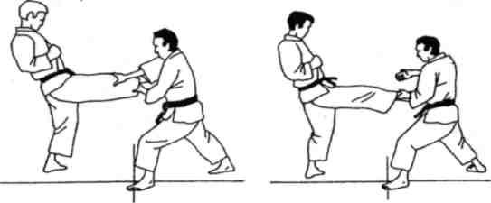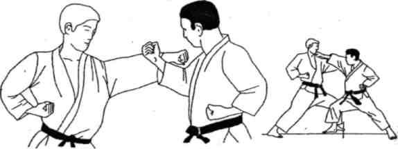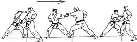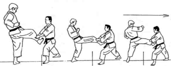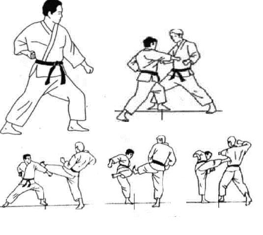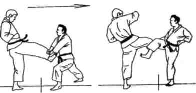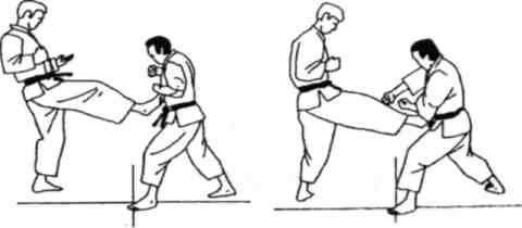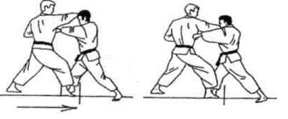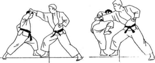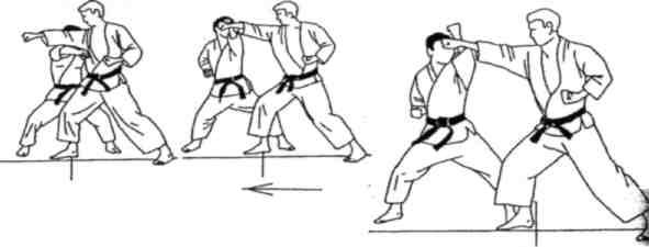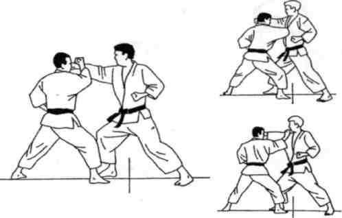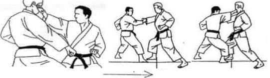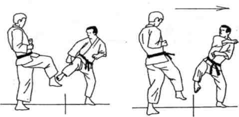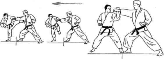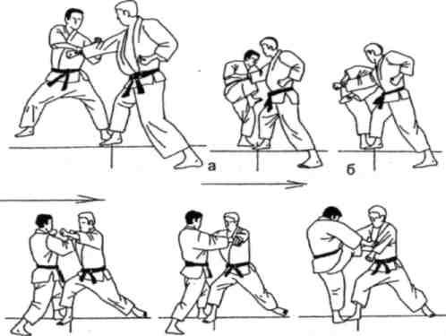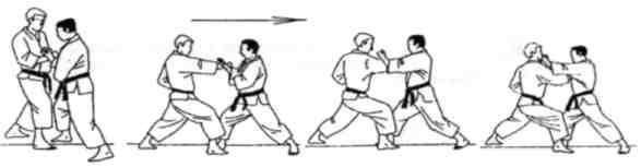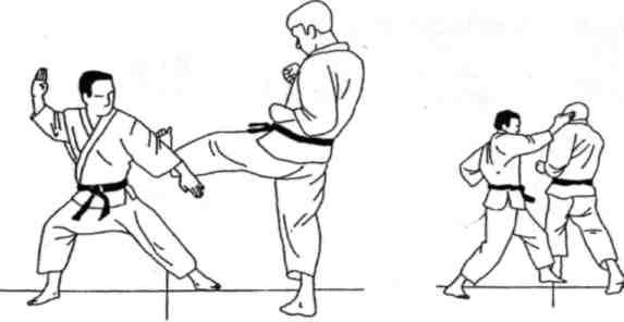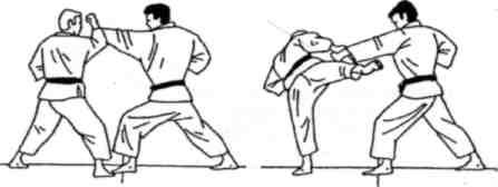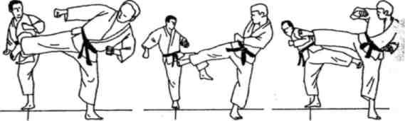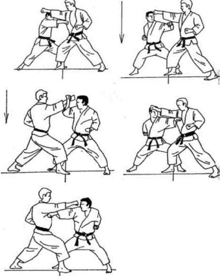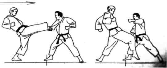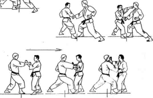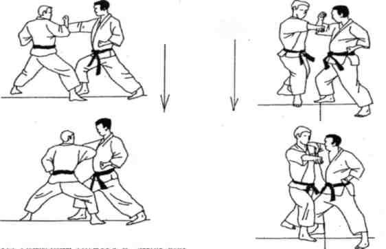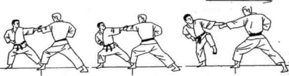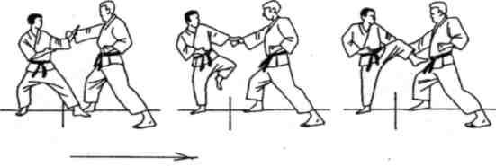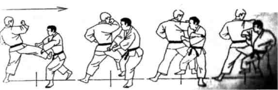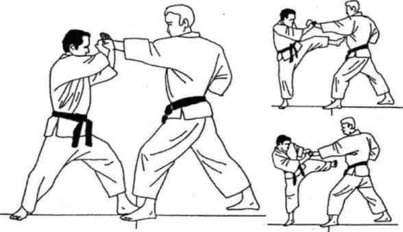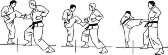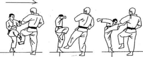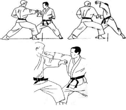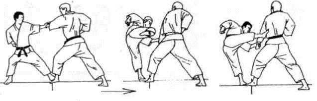 Из МоротэТсукамиУкэ в МаэГери (а) и в МавашиГери (б) (немного сбоку) Из КакивакэУкэ в МаэГери (обычная дистанция) Из ОтошиУкэ в УракэнУчи (а) и в ШутоУкэ (б) (дистанция чуть меньше, чем обычная)