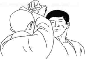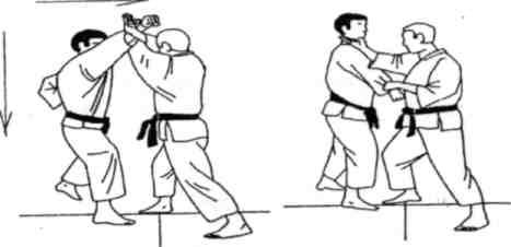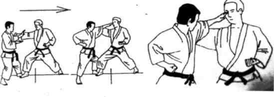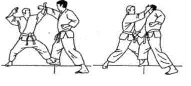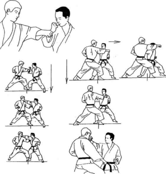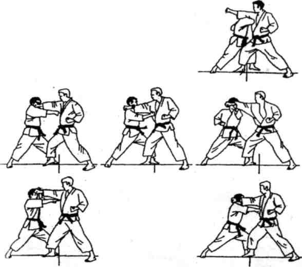 Из ДзюдзиУкэ против атаки в голову в МавашиШутоУчи изнутри наружу (обычная дистанция) Кэнтсуи (обычная дистанция) Из ДзюдзиУкэ против атаки в голову в МавашиШутоУчи снаружи внутрь (обычная дистанция) От ДзюдзиУкэ против атаки в голову к МаэГери (относительно далеко друг от друга) От ДзюдзиУкэ против атаки в голову к УраШутоУчи (обычная дистанция; рис. справа вверху) или к СейрютоУчи (обычная дистанция)