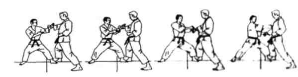Из ГаиВанУчиУкэ в Цуки (обычная дистанция) Из ГаиВанУчиУкэ с поддержкой другой кистью в УраЦуки (дистанция чуть меньше, чем обычная) Из УчиУкэ в Цуки (обычная дистанция) Из УчиУкэ в МавашиЦуки (обычная дистанция) Контратаки из КакэШутоУкэ