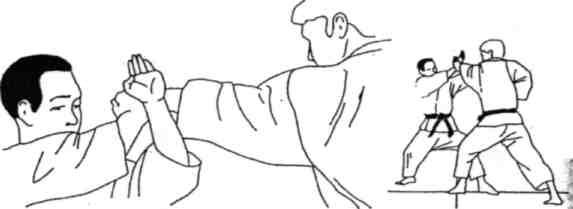 От СокумэнАвасэУкэ против атаки в голову к МаэГери (обычная дистанция, рис. справа вверху) или к МавашиГери (обычная дистанция, рис. справа внизу. Глава 10. Защита и контратаки против атак в корпус (чудан)