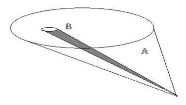 У параплана есть два конуса возможности. Конус А на рисунке - это конус, в котором параплан может приземлиться в заданную точку, используя свои аэродинамические качества. Конус Б на том же рисунке - это пространство, в котором параплан может прийти в ту же точку при прямолинейном полёте, используя только управление с помощью клевант. Данный конус в десятки (если не сотни) раз меньше основного. Именно этот конус возможности используется пилотом, для того, чтобы приземлиться в точку. Именно в точку, а не на площадку и, в дальнейшем, об этом не нужно забывать. То есть, приземление будет по-парашютному, с тем же расчётом и тем же типом обработки глиссады. И, конечно же, нет никакой необходимости строить посадочную глиссаду с высоты более 100 метров и выше, чтобы не превратить прекрасный полёт в банальную борьбу с высотой, удалением.... Хотя, первые полёты для тренировки точности по-спортивному и нужно стремиться делать с как можно длинной последней прямой, для отработки навыков. Со временем, вы будете укорачивать эту прямую после последнего разворота, овладев методом ведения центра круга визуально.