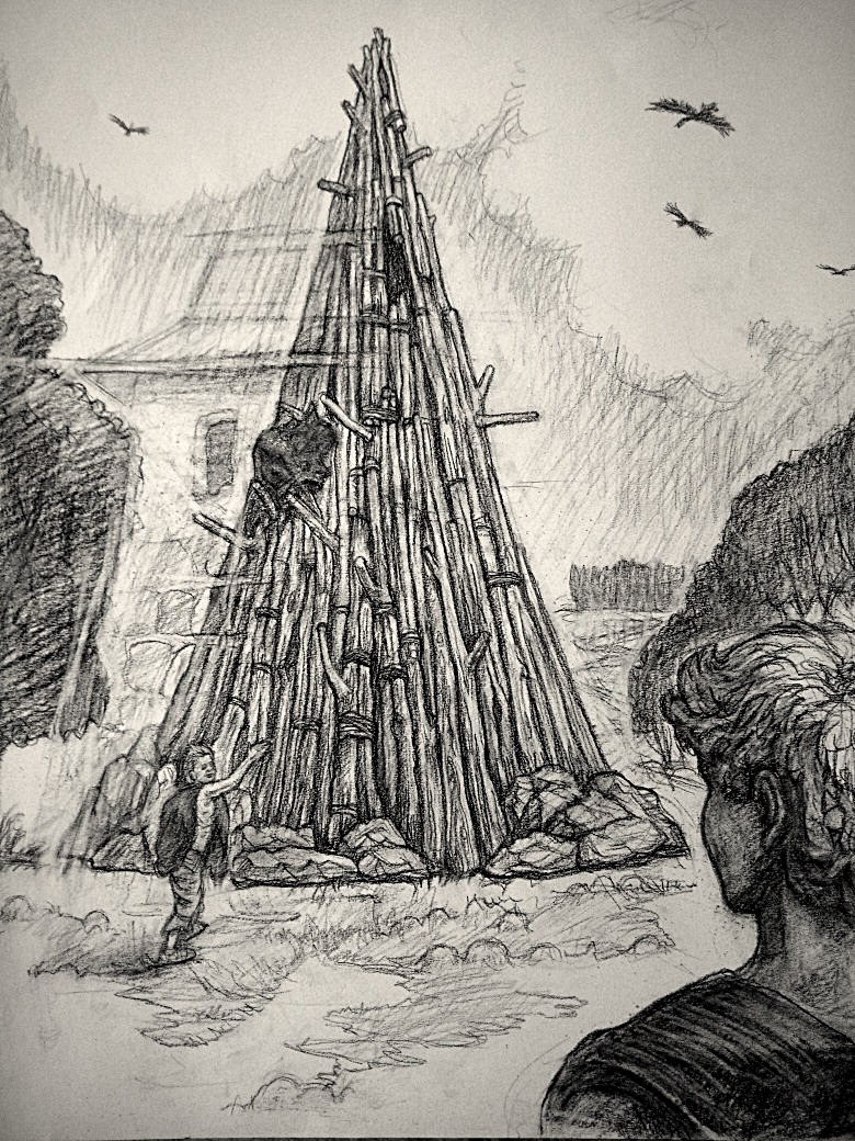 Вблизи выяснилось, что строение не имеет дверей, окон, да и вообще каких-либо отверстий, подходящих для того, чтобы в него проникнуть. Снизу, местами на высоту человеческого роста, оно было тщательно заложено дерном, а дальше вверх уходили кривые бревна. Они стояли неровной стеной и под небольшим углом были сведены к центру.