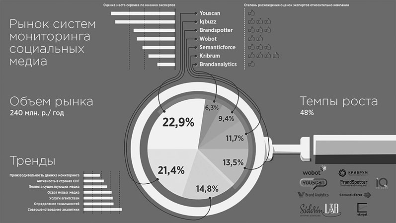 Согласно опросу, объем рынка систем мониторинга в социальных медиа в России составляет сегодня около 240 млн руб. в год и имеет темп роста 48 %. Лидерами были признаны YouScan и IQBuzz, которые охватывают около 45 % общего количества проектов по мониторингу.