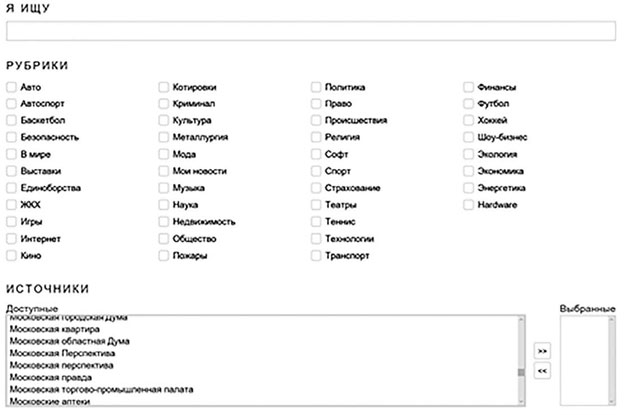 Можно искать сообщения по конкретным рубрикам, а также выбирать конкретные сайты-источники интересующих упоминаний, то есть настроить поиск так, чтобы новости отыскивались только на заданных новостных сайтах. Присутствует настройка поиска по конкретным регионам-государствам и ограничение по датам.