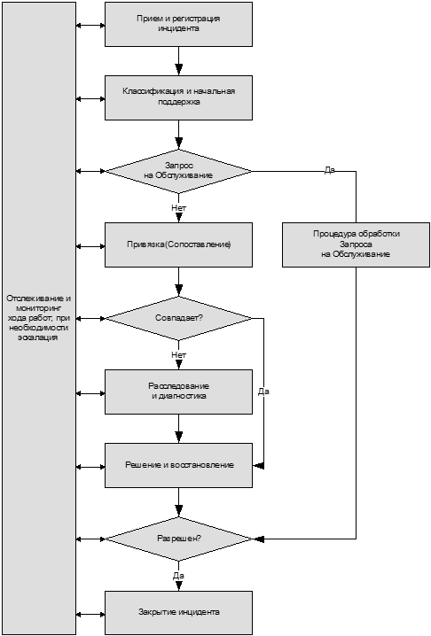Классификация и начальная поддержка (Classification and Initial Support) присваиваются тип, статус, степень воздействия, срочность, приоритет инцидента, SLA и т.п. Пользователю может быть предложено возможное решение, даже если оно только временное.