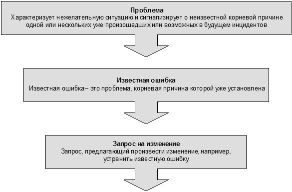 На рис 5.1 показаны взаимосвязи между проблемой, известной ошибкой и Запросом на Изменение и даны определения этих терминов.