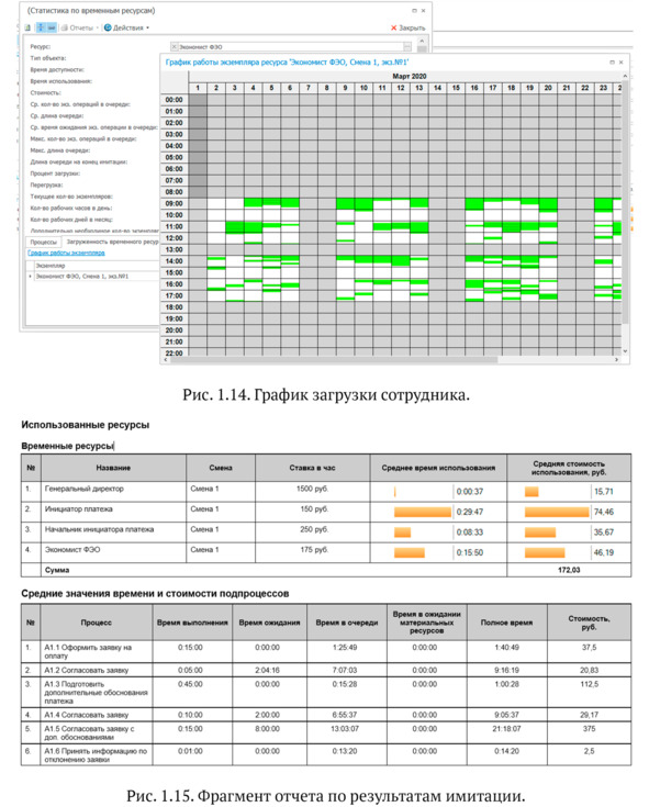 На рис. 1.14 показан график загрузки Экономиста ФЭО. Зеленым показаны часы его работы. Видно, что этот сотрудник весьма сильно загружен работой по проверке заявок на оплату у него остается не так уж много свободного рабочего времени. Обратите внимание, что посмотреть этот график можно только до формирования отчета по имитации (после формирования отчета он становится недоступным).