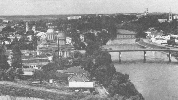Как всегда, в центре города базарная площадь. Здесь стоит путевой дворец, здесь раскинулись каменные в арках ряды, здесь классическая нелепо окрашенная в зеленый цвет часовня, выстроенная архитектором Львовым, здесь и каменный ампирный собор, почти рядом с Борисоглебским монастырем. Собор и колокольня с тосканским, ионическим и коринфским ярусами звона той шаблонной, казенной, всегда грамотной классической архитектуры, согласно которой возводились подобные сооружения повсюду и в Рыбинске, и в Арзамасе, и в Белгороде...