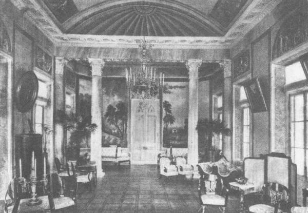 В Люблине от круглого центрального зала в два света отходят четыре крыла, также вмещающие в себя залы; углы между выступами заполнены круглящимися колоннадами тосканского ордера. Таким образом, пять залов нижнего этажа не дают совершенно возможности расположить жилые комнаты, оттесненные в антресоли выступов; весь дворец с его дневным светом залитыми залами, всегда поочередно солнечными, под куполом, увенчанным статуей, кажется увеселительным павильоном, нарочно построенным для блестящих празднеств. Превосходные декораторы, живописцы и лепщики покрыли росписями и орнаментальными отделками потолки и стены внутри. Изящно и тонко орнаментированы филенки дверей, падуги, карнизы, панели. В одном из залов уцелел еще превосходный плафон Скотти; но нет уже еще недавно здесь стоявшей старинной мебели кресел и диванов карельской березы, украшенных подлокотниками в виде грифонов и лебедей, деревянных резных и позолоченных торшеров, бронзы люстр, часов и канделябров. Все это ушло, расхищенное и поломанное... И рисуется символом текущих лет стоящая на одной из [террас] фигура античного божества Молчания, фигура, приложившая к своим каменным устам палец...