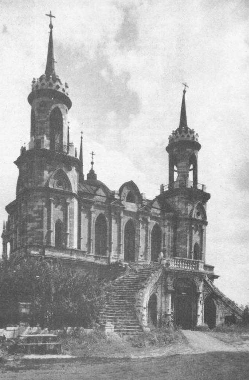 Другой архитектурно значительный памятник Быкова еще уцелевшая церковь, восходящая, по-видимому, к Казакову и повторяющая здесь псевдоготическую декорацию крайне типичного, сложнофигурного в плане сооружения. Барочная сущность псевдоготики совершенно очевидно сказывается здесь и в плане, и в решении внутреннего пространства, и в композиции масс круглящихся, изломанных, особенно с западной стороны, где расходящиеся марши крутой лестницы, приводящие на высоту храма, поднятого на высоком цокольном этаже, вносят в архитектуру типичнейшие черты беспокойной живописности. Внутри в декорировке стен, в формах иконостаса продолжают звучать элементы псевдоготики, как бы варьирующие здесь черты классицизма; верно, именно в таком типе следует представить себе неосуществленные отделки внутренних помещений Царицынского дворца и его павильонов.
