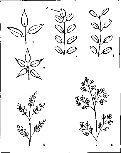 1 тройчатый (тройчатосложный); 2 пальчатый (пальчатосложный); 3 непарноперистый; 4 парноперистый; 5 дважды- и 6 триждынепарноперистый; а листочек