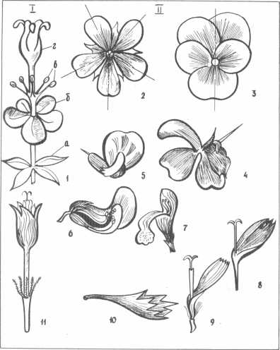 I, 1. Схема: а чашечка; б венчик; в тычинки; г пестик. II. Форма: 2 правильный (несколько осей симметрии); 3 неправильный (одна ось симметрии): 4 асимметричный (ось симметрии провести невозможно); 5 мотыльковый; 6 он же в разрезе; 7 двугубый; 811 цветок семейства астровых: 8, 9 язычковый; 10 воронковидный; 11 трубчатый