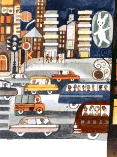 Злая собака прекратила уже погоню, но обезумевший от страха зайчик мчался всё дальше. Так вбежал он в Большой Город. И тут оцепенел от неожиданности: на улицах звонили трамваи, урчали автомобили, по мостовой стучали тысячи подошв. Вокруг сияли неоновые рекламы во сто раз пестрее, во сто раз больше, чем цветы на лугу.