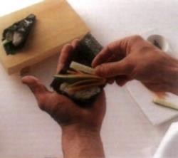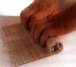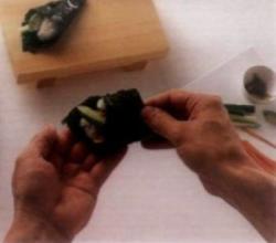 сжимая наполнитель, медленно завершите скручивание рулета. Следите за тем, чтобы край салфетки при этом не завернулся внутрь приготовляемого блюда.
