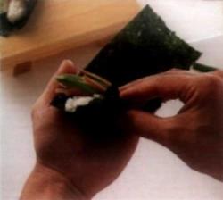 3. Заверните и слегка прижмите правый нижний уголок листа нори. Наполнитель при этом придерживайте пальцами.
