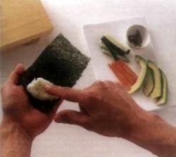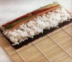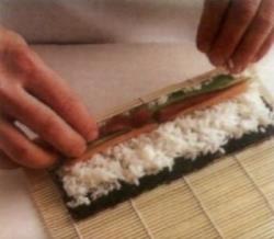 2. Смоченными водой пальцами распределите рис по поверхности листа нори. При этом наполнители положите на нижнюю треть листа.