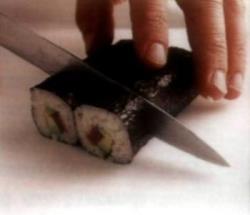 5. Удалите плетеную бамбуковую салфетку и разделите рулет суши пополам очень острым ножом.
