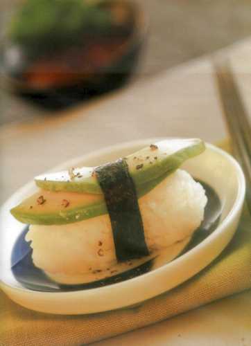 5. При приготовлении блюда следует каждый раз брать в левую руку кусочек рыбы смазанной васаби стороной вверх, класть сверху рисовый шарик, слегка прижимать его к рыбе, затем все переворачивать рисом вниз и указательным пальцем скруглять верхнюю поверхность, придавая ей куполообразную форму.
