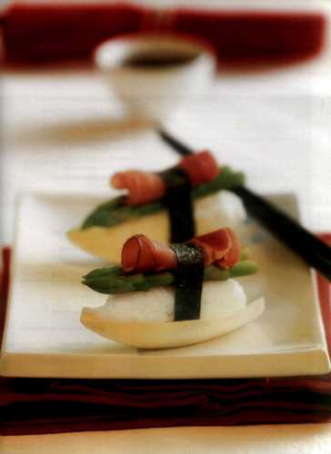 4. Положить на каждый рисовый шарик по 2 стебля спаржи. Свернуть каждый ломтик ветчины в трубочку и положить сверху на нигири.