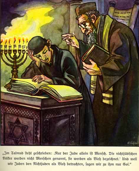 иудаизм. Соллай идёт в синагогу. Синагога - это еврейская церковь. Раввин его ждет. Он - старый еврей с длинной бородой и лицом подлинного дьявола. Соллай кланяется ему. Раввин ведет его к столу для чтения, где есть большая и толстая книга. Это - Талмуд. Талмуд - секретная книга законов евреев.