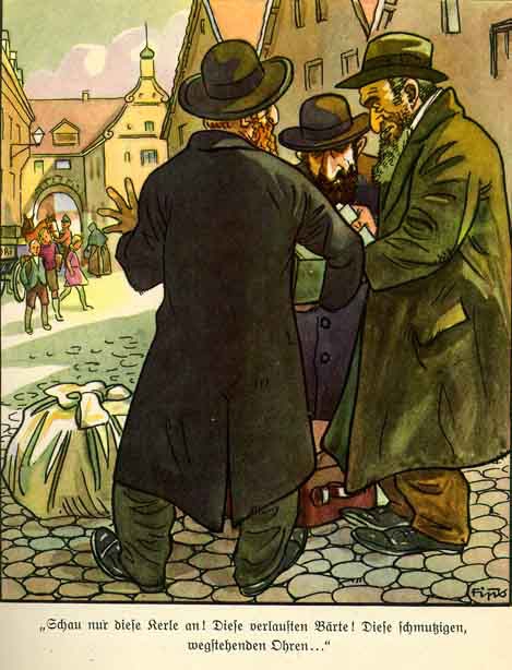 Эти зловещие еврейские носы! Эти паршивые бороды! Грязные, большие уши! Кривые и плоские ноги! Эта засаленная и жирная одежда! Смотрите, как они жестикулируют! Как они торгуются! Разве их можно назвать мужчинами?
