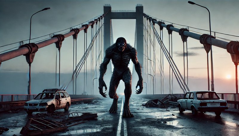 Из под моста выбралось нечто, что когда-то, возможно, было человеком. Теперь это было трёхметровое чудовище, больше похожее на зверя. Оно передвигалось на четырёх лапах, тело его было покрыто тёмной, бугристой кожей, а глаза были черны как ночь. Оно посмотрело на нас, чуть склонив голову набок, и выдало утробный рёв, от которого внутри всё сжалось.