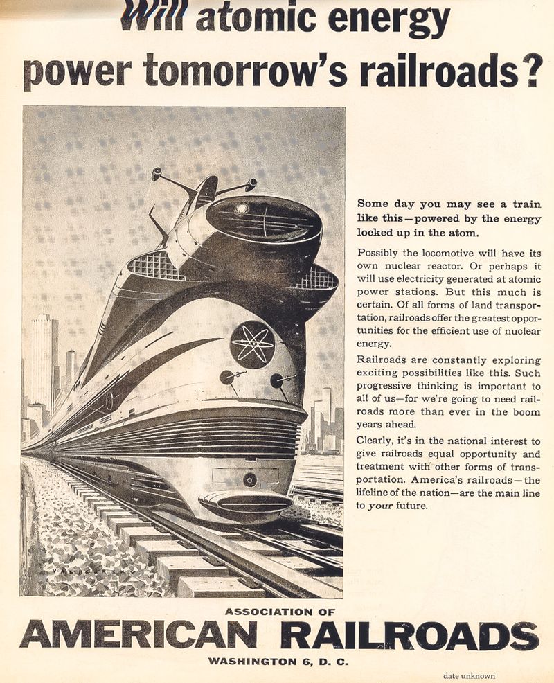 «Согласно одному из проектов, атомовоз локомотив будущего должен весить 300 т, что вдвое больше, чем современные крупные паровозы. Его длина 50 м, высота 5 м. На локомотиве предполагается применить реактор с раствором урановой соли в воде, содержащим 9 кг урана235. Слой защиты от атомных излучений будет иметь толщину 1,2 м. Пар, образовавшийся за счет тепла реактора, поступает на турбину, вращающую электрогенераторы. Ток от них поступает на 12 тяговых двигателей мощностью по 600 лошадиных сил каждый. Предполагаемый расход горючего такого атомовоза 15 г на 1 тыс. км пробега».Что сбылось:Петр Асташенков «Атомная промышленность» (М., Воениздат, 1956)