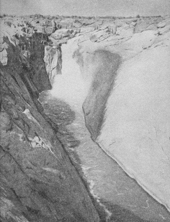 По краю ущелья приходится двигаться очень осторожно: скалы скользкие и круто обрываются вниз. Один неверный шаг или легкое головокружение, и страшная смерть неминуема. Большинство читателей, наверное, видели фотографии водопада Виктория. Если так, то попытайтесь представить себе Ауграбис. Он на целую треть выше, и воды в нем вдвое больше.