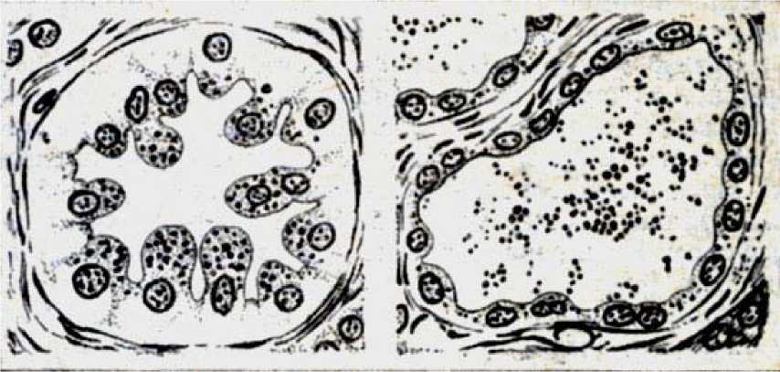 Рис. 22. Альвеолы молочной железы (поперечный разрез). Слева - секреторные клетки заполнены молоком, справа -клетки выделили свой секрет в полость альвеолы; их вид изменился. Черные точки - специально покрашенные капельки жира
