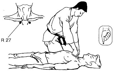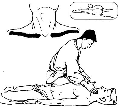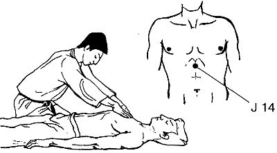 6. Пострадавший лежит на спине. Расположить свои руки на грудной клетке пострадавшего. Произвести силовой массаж кончиками пальцев в направлении пупка и под мечевидным отростком глубоко нажать на точку Кокэну, J14. Повторить это движение 5-10 раз.