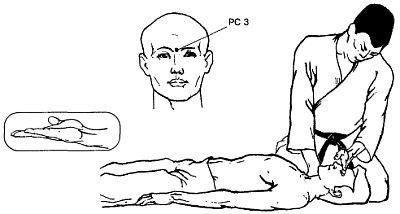 3. Уложить пострадавшего на спину и ребро ладони установить на переносицу (точка РСЗ), ладонью в сторону тела. Так держать неподвижно или с вибрацией 45 минут.