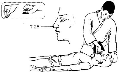 Кода, Т25 распологается в центре кончика носа. Применяется при шоке, обмороке, носовом кровотечении.